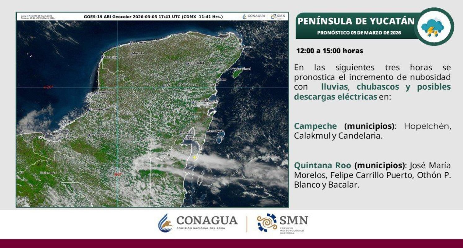En la región de la Península de Yucatán, las lluvias podrían presentarse acompañadas de descargas eléctricas, rachas de viento y, de forma aislada, caída de granizo. Estas condiciones podrían ocasionar incremento en el nivel de ríos y arroyos, además de posibles inundaciones en zonas bajas, por lo que autoridades recomiendan mantenerse atentos a los avisos meteorológicos.