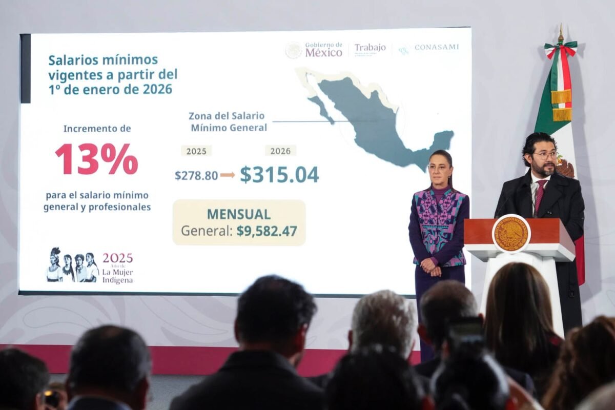 Ciudad de México a 04 de diciembre de 2025.- A partir del 1 de enero de 2026 el salario mínimo general tendrá un aumento de 13% pasando de 278.80 a 315.04 pesos diarios, en beneficio de 8.5 millones de personas, luego de un acuerdo con el sector obrero patronal, anunció Claudia Sheinbaum Pardo, presidenta de México. Para la Zona Libre de la Frontera Norte (ZLFN) el aumento será de 5% a 440.87 pesos diarios.