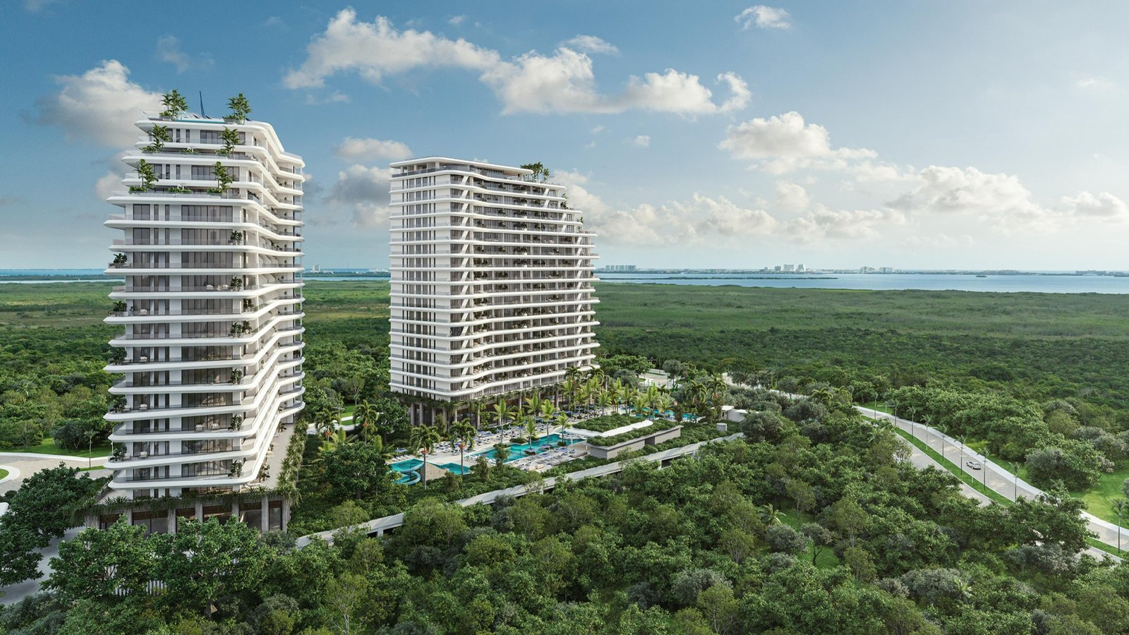 El desarrollo se construye frente a la laguna Nichupté, en Cancún, y contempla dos torres de 20 niveles, villas premium y más de 50 amenidades bajo un modelo de Hotel Living, que combina uso residencial con operación profesional.