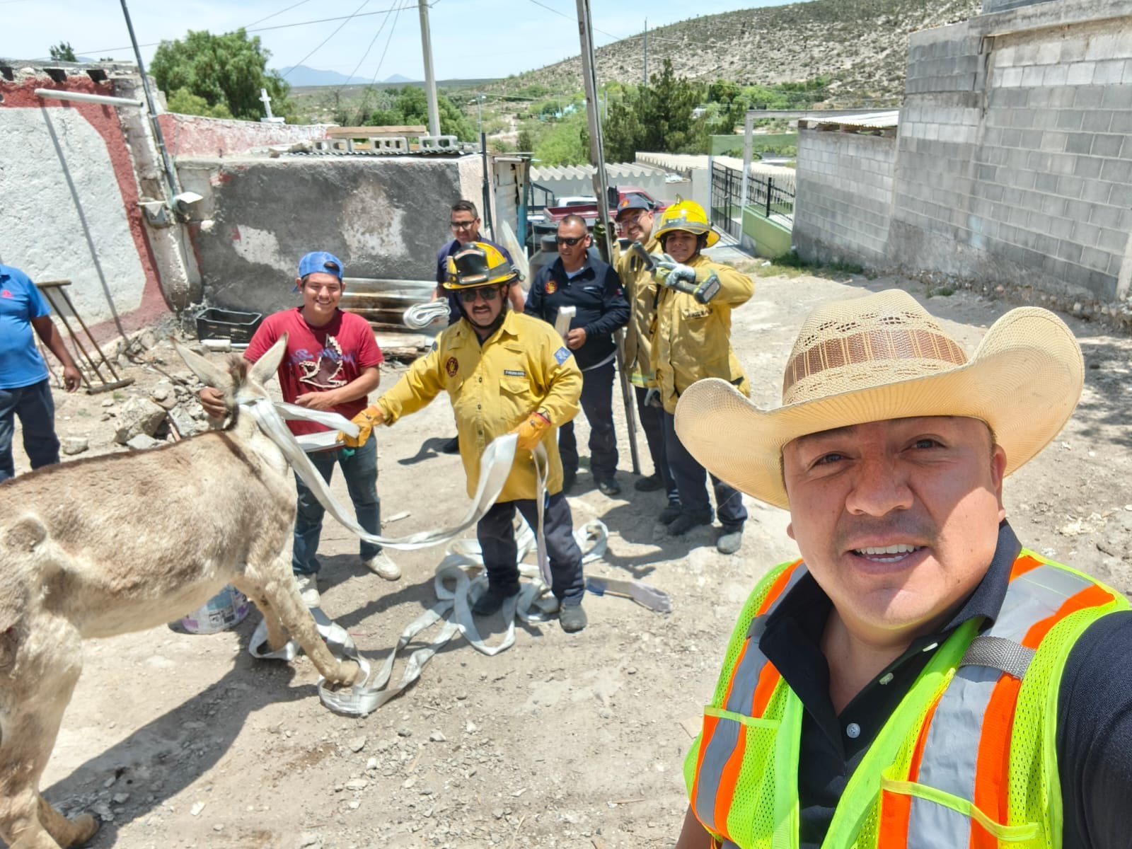 SALTILLO, Coah., a 28 de abril de 2026.— Una burra fue rescatada con vida luego de permanecer cerca de 48 horas atrapada en una fosa sanitaria en el ejido Guadalupe Victoria, en la zona rural de Saltillo, en un hecho que movilizó a vecinos y cuerpos de emergencia.
