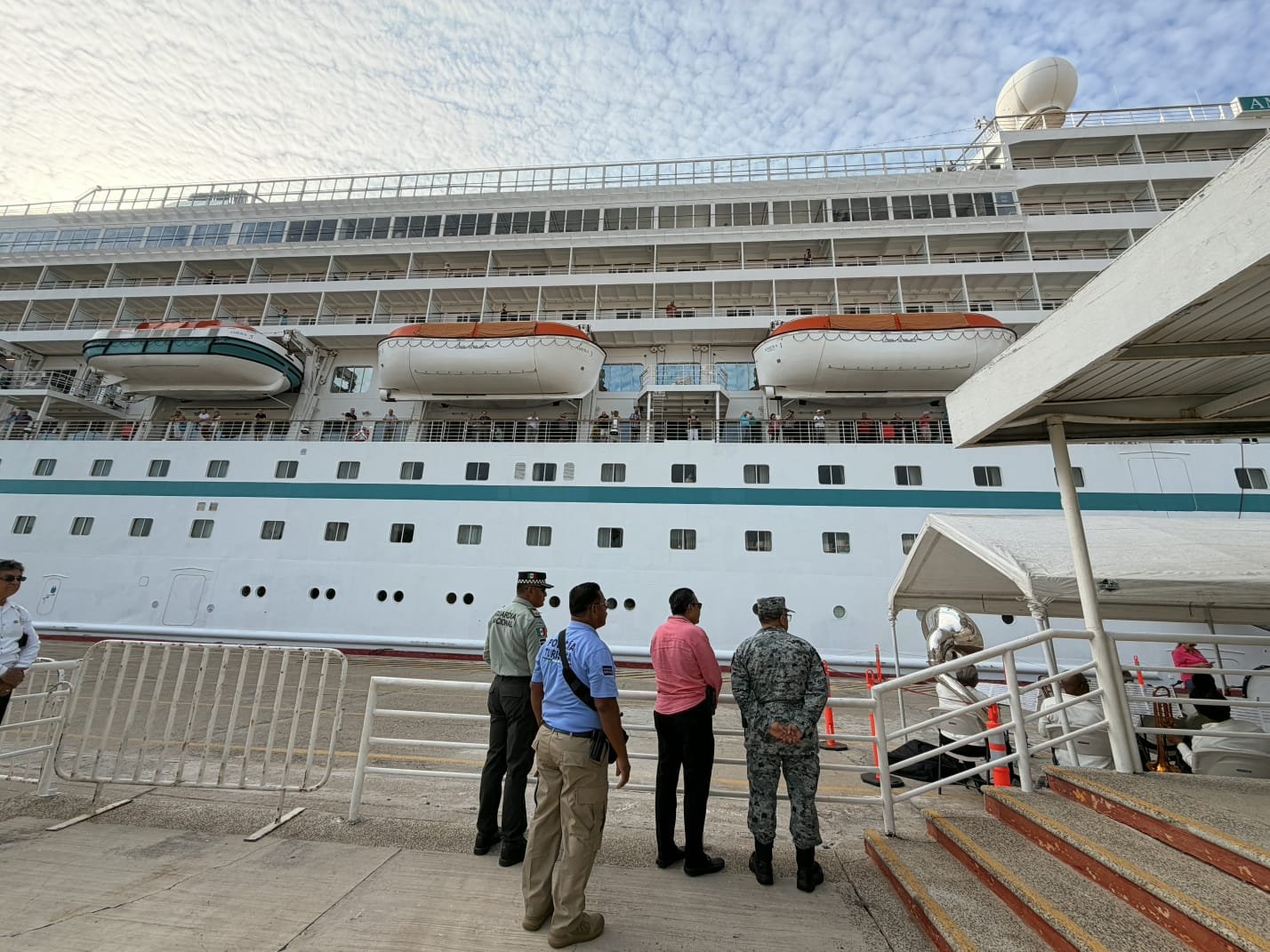 Durante la llegada de los visitantes participaron autoridades de los tres niveles de gobierno, así como elementos de la Guardia Nacional, en un operativo coordinado para mantener el orden y la seguridad en la zona portuaria y áreas turísticas.