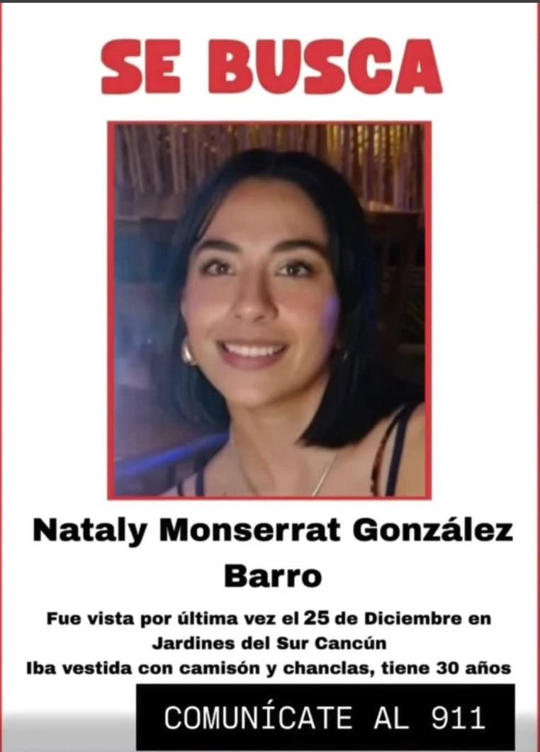 Cancún, Q. Roo., a 29 de diciembre de 2025- Nataly Montserrat González Barro, joven veterinaria de 30 años de edad, fue encontrada sin vida la tarde del domingo 28 de diciembre en una zona de maleza ubicada en el fraccionamiento Jardines del Sur de esta ciudad.