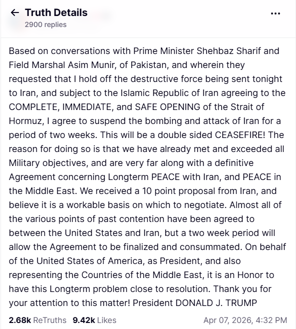 El anuncio establece un posible alto al fuego bilateral, condicionado a que Irán permita la apertura total del Estrecho de Ormuz.