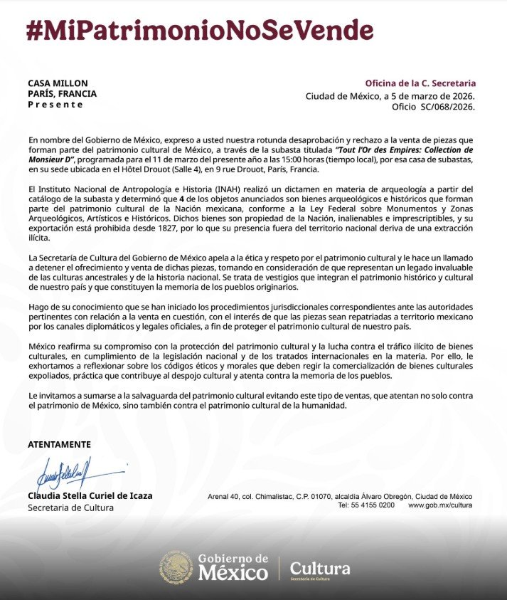 De acuerdo con una carta oficial enviada por la Secretaría de Cultura, el Estado mexicano expresó su “rotunda desaprobación y rechazo” a la comercialización de estos objetos arqueológicos, al considerar que forman parte del patrimonio histórico nacional y que su presencia fuera del país deriva de una extracción ilícita.