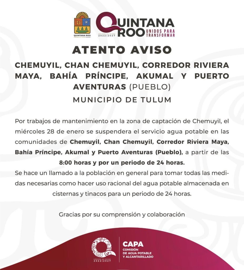 TULUM, Q. Roo, a 28 de enero de 2026.— El Gobierno de Quintana Roo, a través de la Comisión de Agua Potable y Alcantarillado (CAPA), informó que este miércoles 28 de enero se suspenderá el servicio de agua potable en diversas comunidades del municipio de Tulum y en el corredor turístico de la Riviera Maya, debido a trabajos de mantenimiento en la zona de captación de Chemuyil.