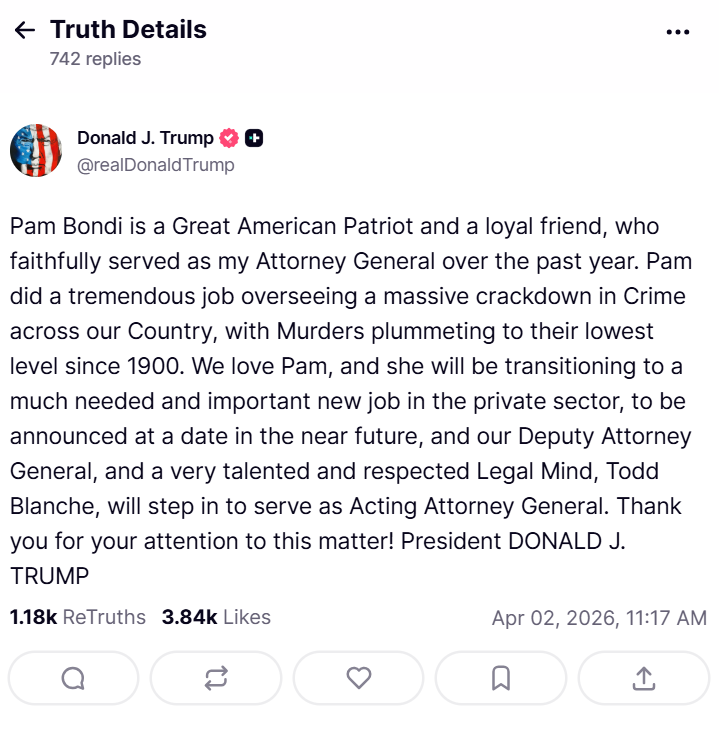 Trump informó que Bondi se integrará al sector privado en un puesto que será revelado próximamente.
