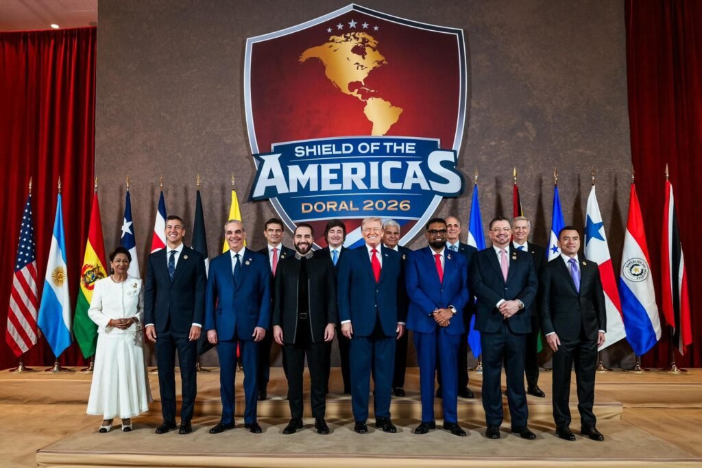 FLORIDA, E.U., a 07 de marzo de 2026.- La nueva iniciativa regional conocida como “Escudo de las Américas”, promovida por el presidente estadounidense Donald Trump, arrancó en Miami con la participación de una docena de líderes latinoamericanos. El encuentro busca consolidar una alianza de seguridad regional, pero generó polémica debido a que México no fue invitado.