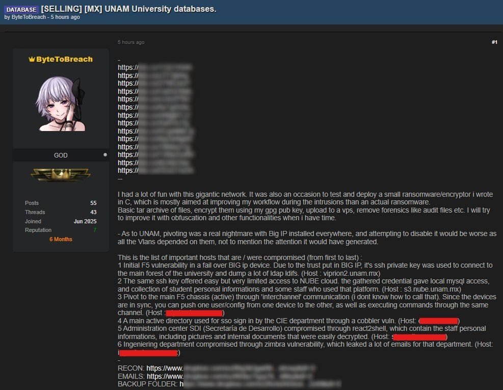 Asimismo, plataformas de monitoreo de ciberseguridad como Hackmanac difundieron una alerta temprana en la que un actor identificado como ByteToBreach afirma haber vulnerado sistemas de la UNAM, reporte clasificado como pendiente de verificación, basado en información de fuentes abiertas y de monitoreo en la web profunda, sin confirmación oficial.