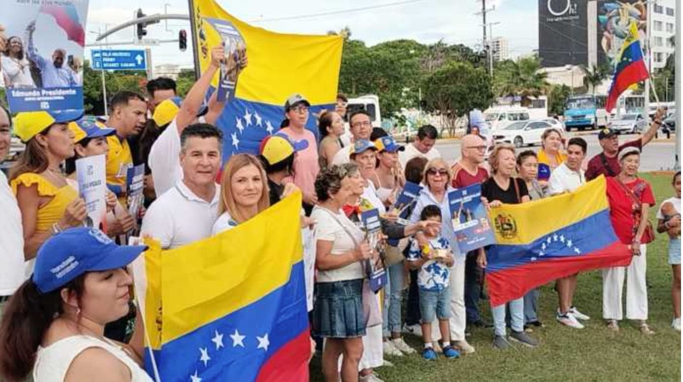 CANCÚN, QRoo, a 04 de enero de 2026.- Integrantes de la comunidad venezolana radicados en Cancún llevaron a cabo este domingo una manifestación pacífica en la glorieta de El Ceviche para celebrar la reciente detención del presidente de Venezuela Nicolás Maduro, por parte del gobierno estadounidense.